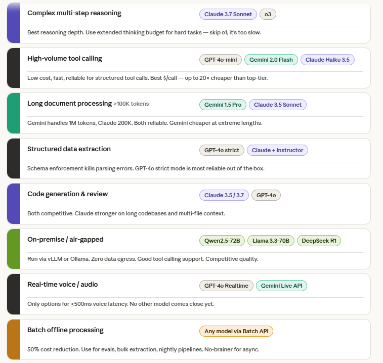High-volume tool callingGPT-4o-mini / Gemini 2.0 Flash / Claude Haiku 3.5Low cost, fast, reliable for structured tool calls. Best $/call.