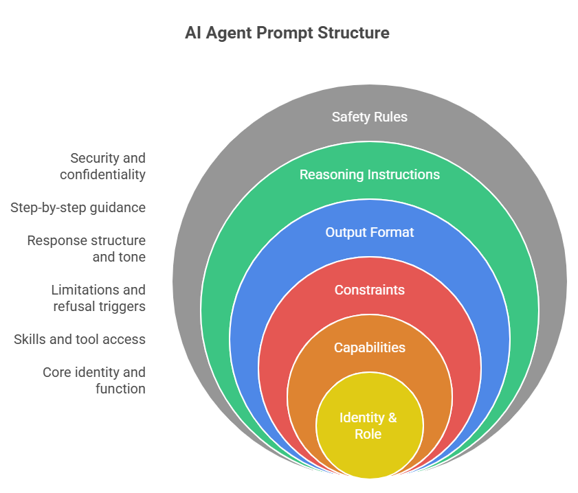 | Production System Prompt Structure (recommended layers): Layer 1 — Identity & Role: Who the agent is, its expertise domain, its primary function Layer 2 — Capabilities: What it CAN do, which tools it has access to and when to use them Layer 3 — Constraints: What it CANNOT do, what to refuse, escalation triggers Layer 4 — Output Format: Expected response structure, length, tone, citation requirements Layer 5 — Reasoning Instructions: Step-by-step requirements, verification steps Layer 6 — Safety Rules: Injection defense, data handling, confidentiality of system prompt |